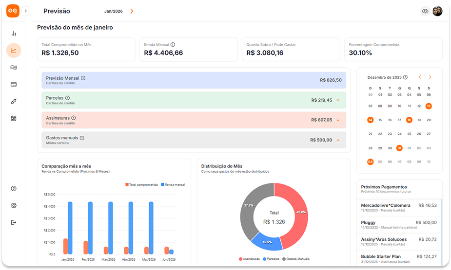Conecte suas contas e cartões e descubra gastos invisíveis, parcelas futuras e dinheiro já comprometido.